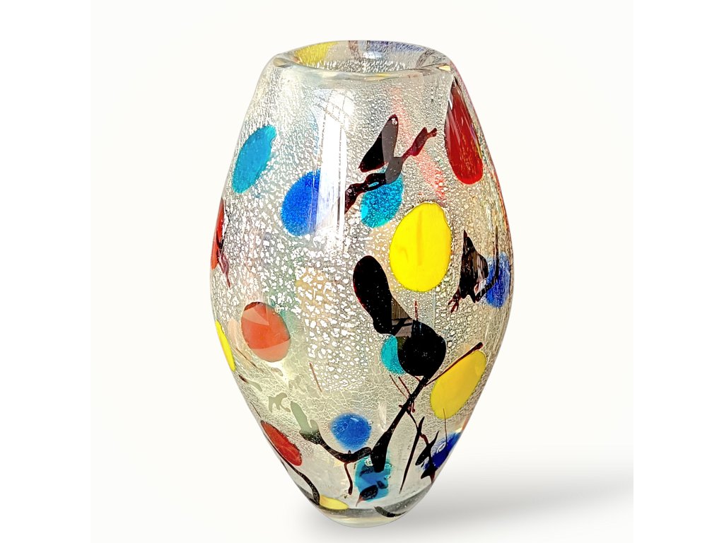 Vneste do svého interiéru špetku umění s touto ručně foukanou skleněnou vázou o výšce 25 cm. Tento kus je originál, zdobený živými barvami a abstraktními motivy, které připomínají moderní malbu. Povrch vázy je jemně popraskaný a následně zalitý silnou vrstvou čirého křišťálového skla, což vytváří jedinečný hloubkový efekt a luxusní lesk.