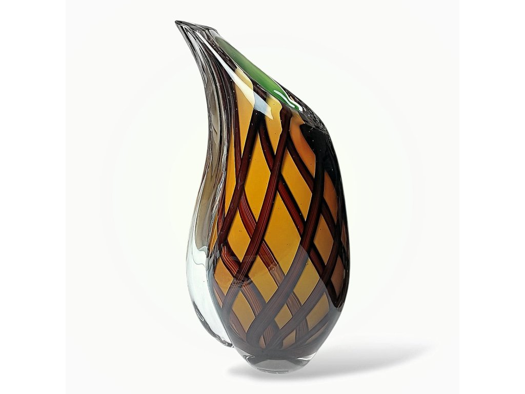 Vneste do svého interiéru eleganci a umělecký dotek s touto jedinečnou ručně foukanou vázou. Kombinace křišťálově čirého skla s barevnými prvky v odstínech oranžové, hnědé a zelené vytváří dynamický vizuální efekt, který zaujme na první pohled