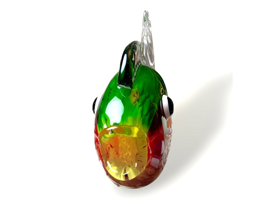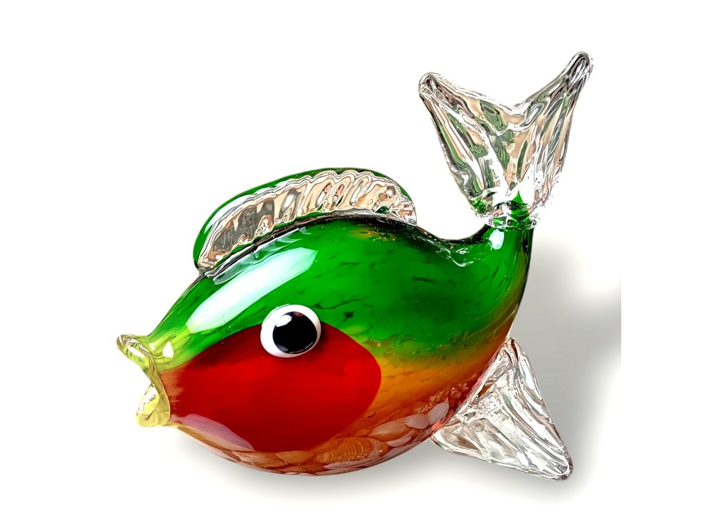 Barevná skleněná ryba je uměleckým dílem, které v sobě spojuje tradiční techniku Murano s moderním citem pro detail. Ručně vyrobená z foukaného skla, zaujme svými živými barvami – od smaragdově zelené přes ohnivě červenou až po oranžové tóny. Průhledné ploutve a ocas s jemnou texturou dodávají dekoraci lehkost a eleganci.
